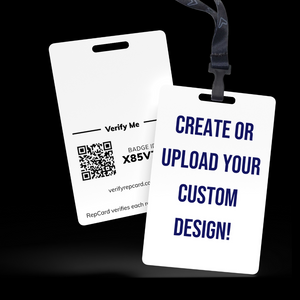 *The front is fully customizable. The back contains a QR code & Badge number from your RepCard account. This is for verification purposes and can be previewed in the app. **When you checkout, include the email on your RepCard account so we can connect this badge to your account.